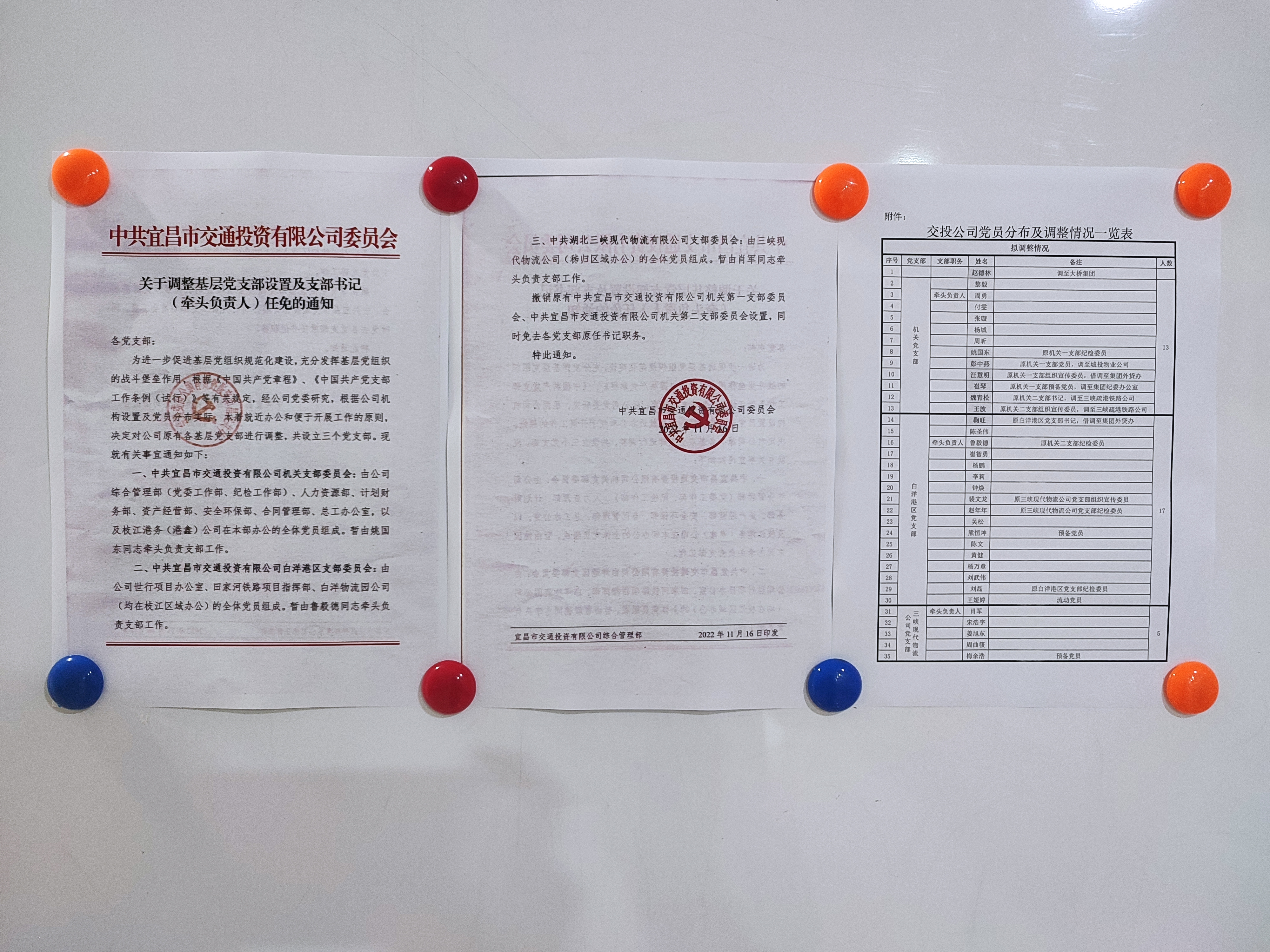 三、本月,交投公司按要求開展了基層黨建工作突出問題專項(xiàng)整治工作,并針對自2022年6月以來各黨支部均未進(jìn)行換屆選舉這一問題,通過多次與集團(tuán)相關(guān)部門對接溝通,經(jīng)公司黨委集體研究決定,完成了基層黨支部調(diào)整設(shè)置工作,并明確了支部牽頭負(fù)責(zé)人,11月18日進(jìn)行公示,從根本上解決了換屆問題。待下一步改革重組人員工作相對穩(wěn)定后,著手開展支委選舉工作。